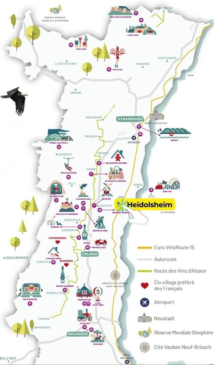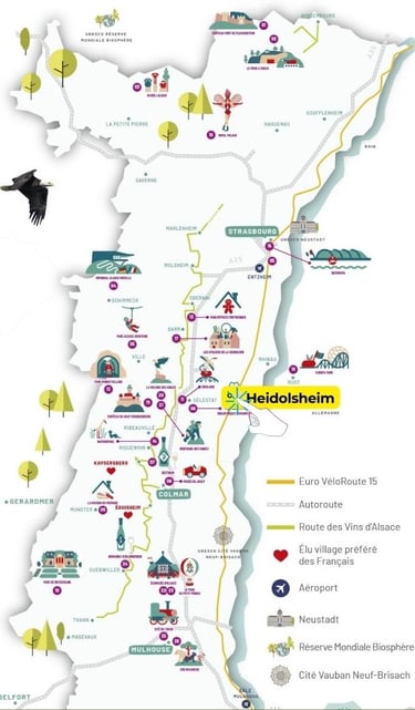 Situé à mi chemin entre Strasbourg et Mulhouse, vous aurez tout loisir de rayonner vers le sud pour visiter Colmar, Kaysersberg, Riquewihr ou Ribeauvillé ou vers le nord pour Mittelbergheim, Obernai, Marlenheim, et bien d’autres magnifiques villages de la route des vins surplombée par de nombreuses ruines de fortifications et l’exceptionnel château du Haut-Koenigsbourg.